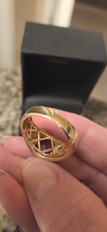 Bought for my husband for Christmas. We’ve been married 41 years and I wanted him to have a second ring. He looked at rings with me and decided he wanted my birthstone which is garnet. We are both very pleased with the look and size of this 5 k garnet ring. Very masculine and luxurious. The sale price was amazing as well.