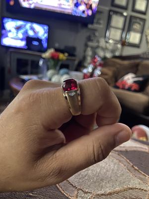 Amazing deep red color for a Ruby. The gem stone itself is bigger than any other that I own. People have complimented me a lot already from wearing it. The ring itself looks very simple and polished. Normally wear a 10 but 10 1/2 is just a bit loose but looks great!