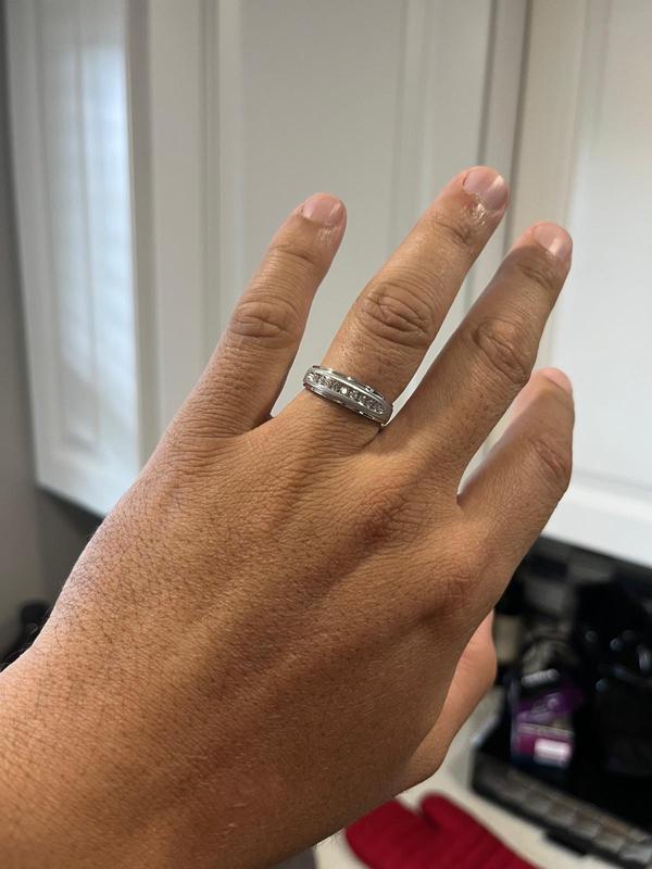 We had been searching for weeks for a ring design that we both liked, my husband and I, and it was by chance, while looking for other things at Macy's, that we found this beautiful design. We are pleased and delighted with our rings. My husband wanted diamonds and I wanted a discreet ring, and we found both in a single ring.