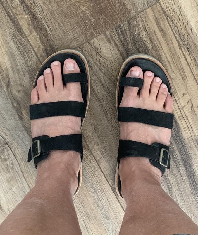 This sandal has the great foot bed I love in their products. I have a high arch and trouble with pain if I don't wear a supportive shoe. This fits the bill and looks great with most summer wear. The buckle allows for adjustment if they stretch with use.