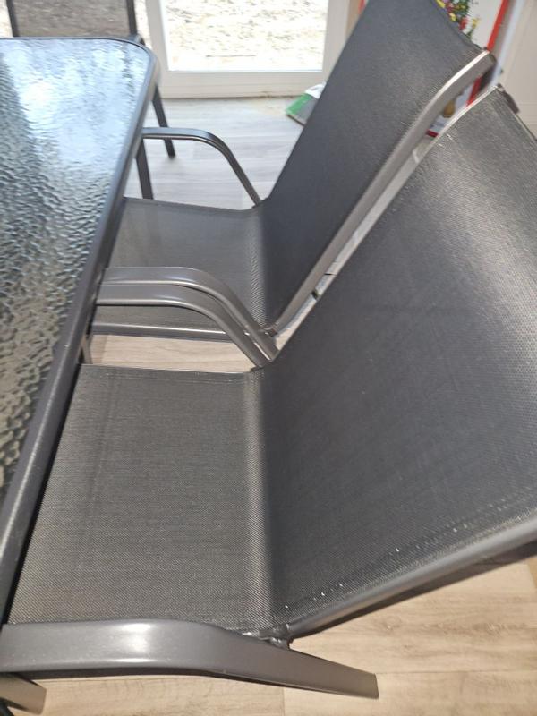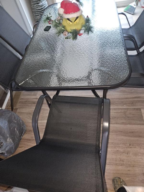 I’m really happy with this patio set overall — it has a sturdy tempered glass table that looks sleek and holds up well outside, plus an umbrella hole which is great for sunny days. The Flex Comfort mesh chairs are lightweight, breathable, and stackable (easy to store) and feel comfortable for casual meals and get-togethers. Assembly is minimal (chairs come ready; the table legs go on quickly) and the weather-resistant frame seems durable. A couple of minor points: the chairs don’t always tuck neatly under the table and the table could feel a bit small when fully loaded with dishes, but for the price and daily patio use it’s a solid outdoor dining option. P.S.: due to snowy weather in pa pictures are made inside .
