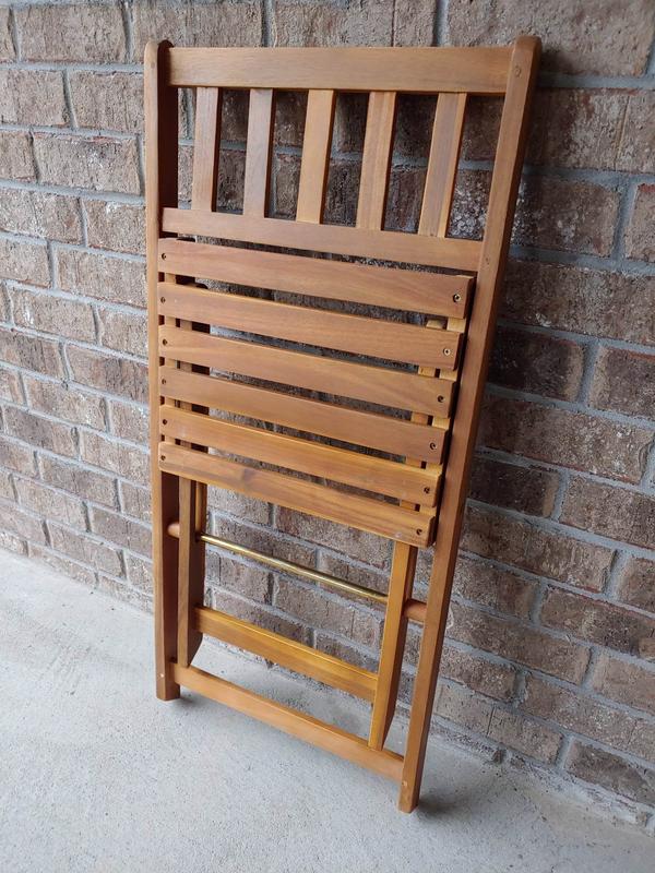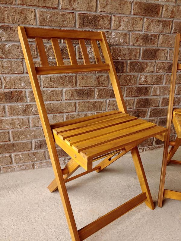 I've been trying to modernize the look of my backyard and these patio bistro chairs are the perfect size and look for a small space. The chairs can easily fold flat and take up less space than other chairs I have. The material is solid and feels comfortable to sit on. I did get some cushions to put on for guests to sit on longer and add more color. The acacia wood color is vibrant and gives my patio a nice natural look. Overall, pleased with these bistro chairs.