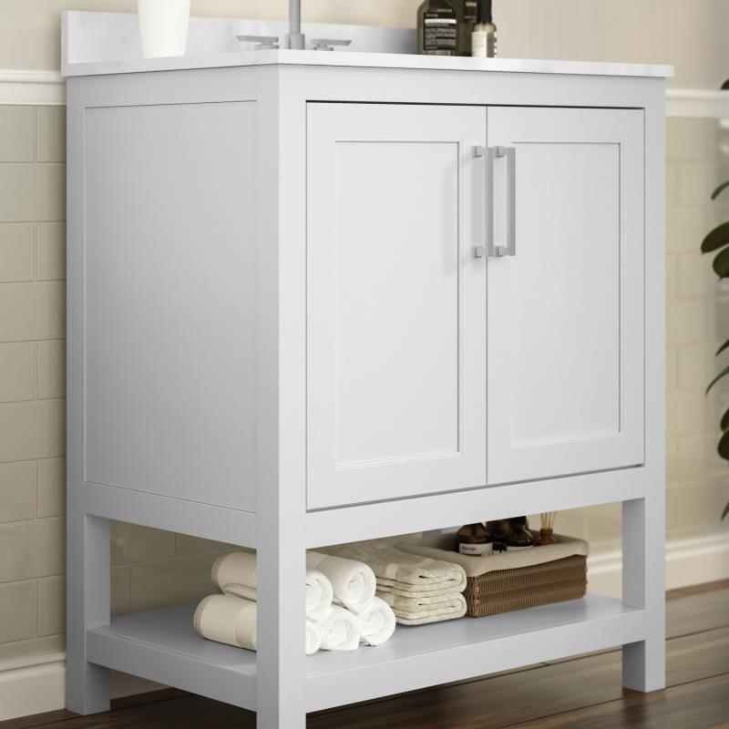 We just moved into our first home and have added this lovely vanity to our bathroom. I went in and added some gold hardware to jazz it up and make it our own since it came with silver handles. The granite top is BEAUTIFUL and the counter space has been so fabulous. Only issue we had was that there is a TINY bit of gapping but you can’t tell now that it’s installed. My husband was able to get it installed pretty easily which definitely was a win for us!