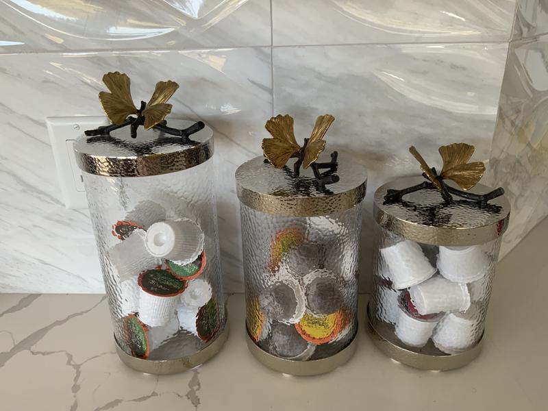 Love this designer, the Gingo leaf pattern. Looks like a Butterfly in a muted gold leaf, sealing silver lid and bubble glass. One gold leaf was bright gold so I just switched the lid with the cookie jar canister. They come in different sizes too. We have a coffee station and I wanted to add a pop of design. These are Perfect for storing our coffee pods of different brands. I use the sap all one for tea and hot Choc.. of course perfect for storing flour, sugar etc also.