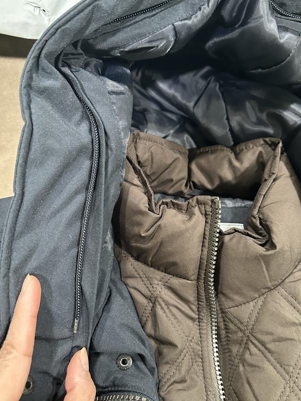 • Stand collar with attached faux-fur trim hood; attached quilted bib