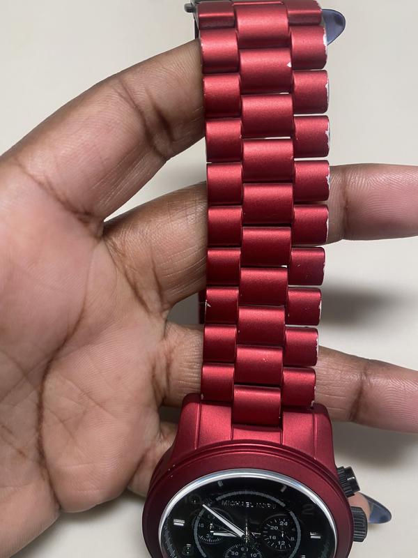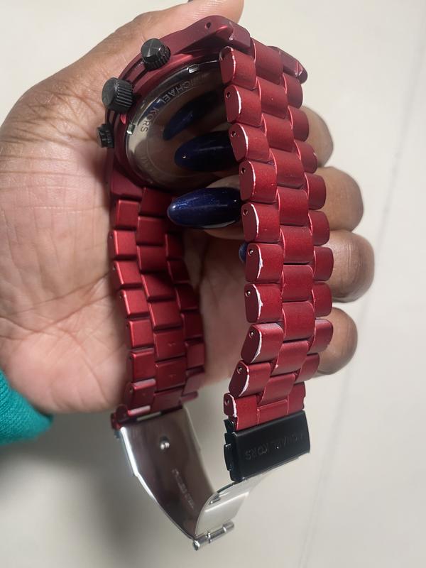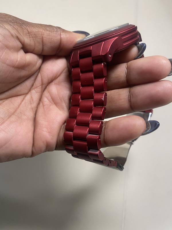 I received the watch damaged and returned the watch the same day. The red color of the metal chips off.