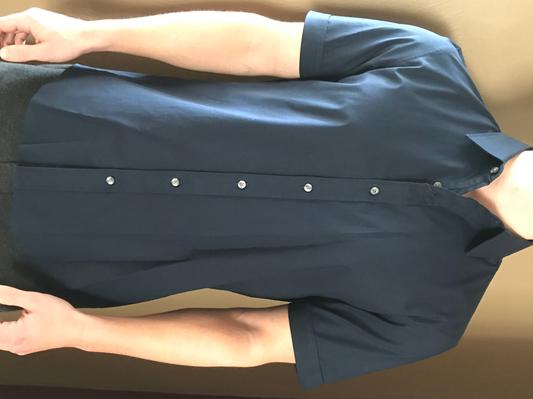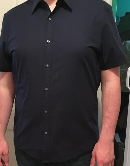 My new favorite button up short sleeve shirt, fits great, not too loose or too tight. Like that it keeps its form, in collar and body with no major wrinkles. Bought the L Navy for work and casual events.