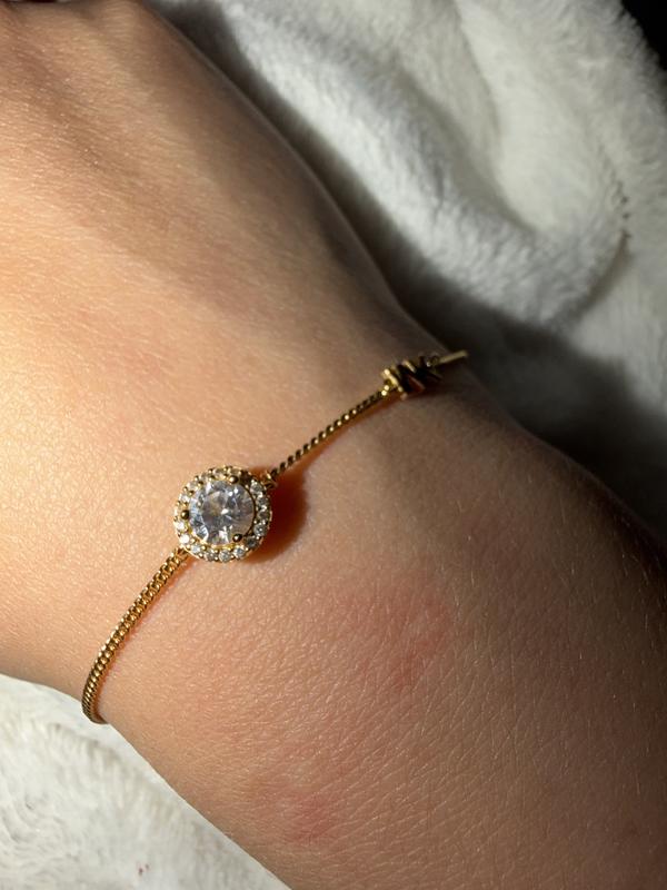 The diamond matches her ring so perfectly that it suits as the best combination for a date night out. Its very thin and fine the bracelet itself but its perfect to look feminine and stand out with the sparkling diamond look.
