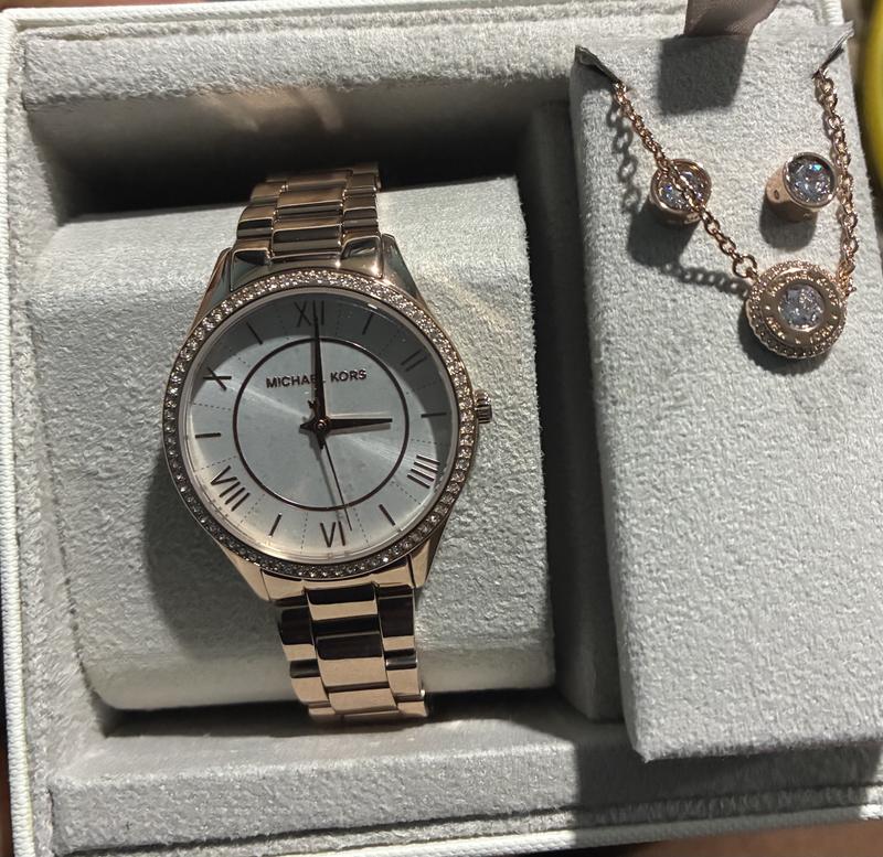 I absolutely love my MK gift set which includes a watch, pair of earrings and necklace. The watch fits perfectly and everything looks great together. This gift to myself didn’t disappoint!.