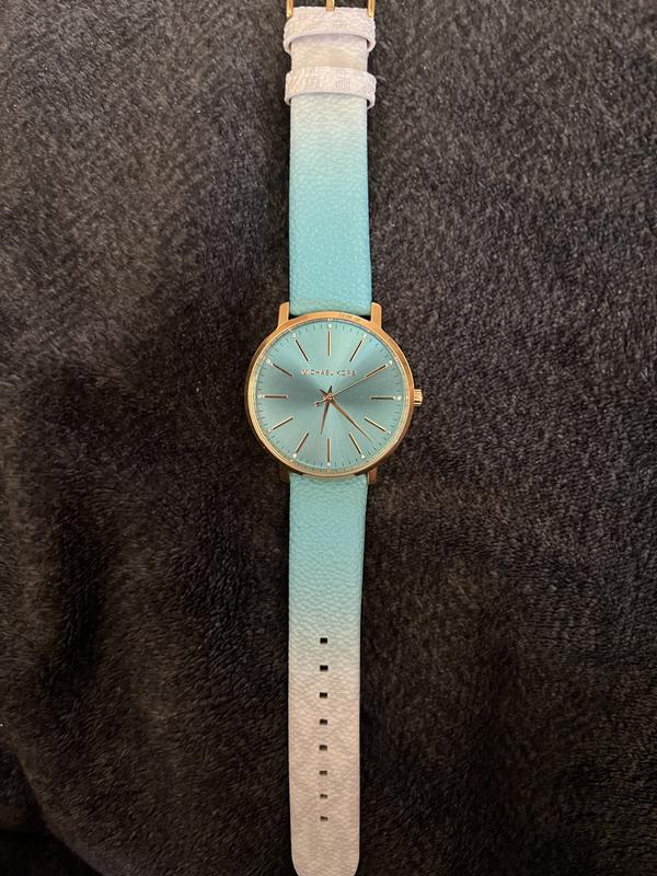 Dear Valued Customer: Thank you for your recent feedback on the Michael Kors Womens Pyper Three Hand Ombre Turquoise Strap Watch you purchased. We are reviewing this item and will update as soon as possible. Because of you, our customers shopping experience will be improved. We look forward to providing you with outstanding customer service. Sincerely, Macy’s Customer Service