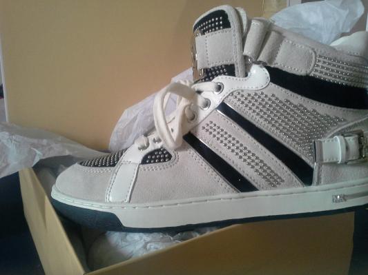 I received these sneakers today and was quite excited as I was ripping open my gift, but once I really saw them I realized they are definitely not as white as I thought. It's honestly my own fault for not having read the description more thoroughly, not to say they aren't very very nice, but the almost taupe color on the suede looking strips just ended up not really how I imagined them to be. I'm definitely going to exchange them for the two tone MK riding boots, can't wait to put those bad boys on !