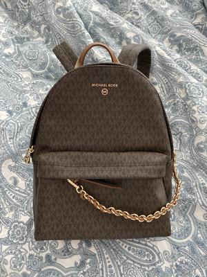 The Slater medium logo backpack is really nice. It’s roomie and allows for an outfit, large enough for personal items in the front pocket and is stylish. It also provides some security with the chain that crosses from the top of the bag to the pocket of the bag.