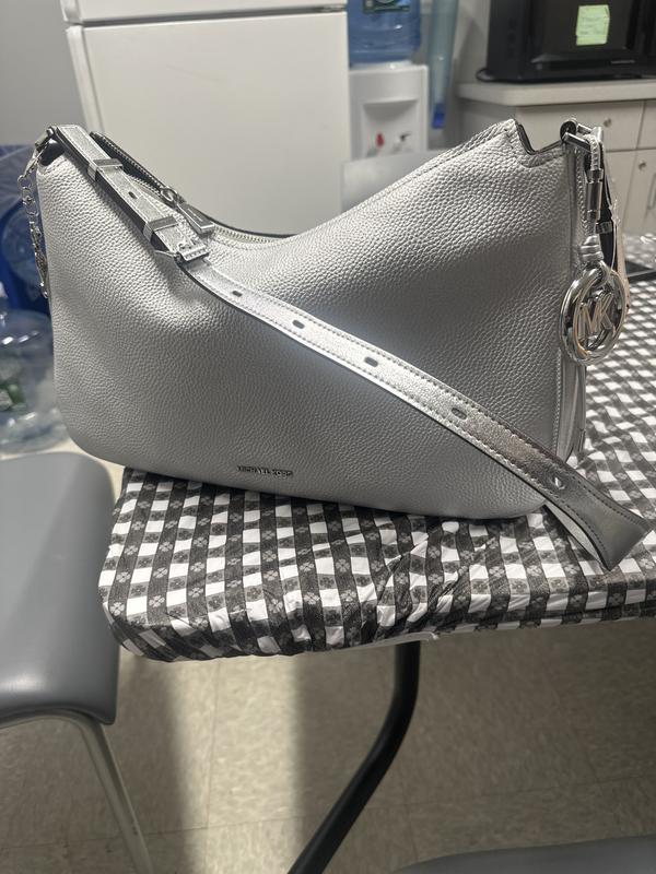 Gorgeous silver leather handbag! Can be used on shoulder or crossbody. Been looking for perfect silver bag for a while.. goes with everything! Best bag I’ve owned!