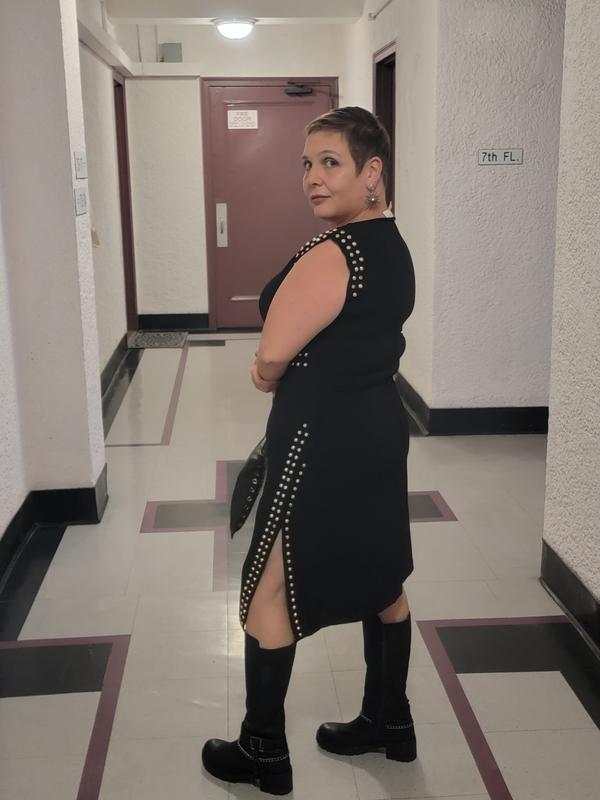 I loved everything about this dress, but unfortunately within about an hour of wearing it, a few of the studs were hanging off the dress. Apparently they are glued on rather than sewn, so they are pretty flimsy. Also, the bottom tag inside the dress is sewn below the slit, so it shows when you walk. I had already cut this tag off and thrown it away so I can no longer return the dress. I am so bummed because the cut is super flattering and the dress is really comfortable. I was pleasantly surprised by how much I loved the dress, because this is my first Michael Kors purchase and I wasn't sure what to expect. Unfortunately the studs are just executed poorly.