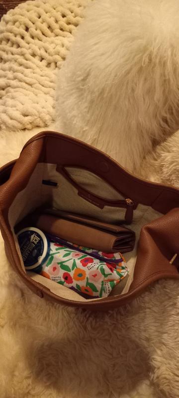 I love the look of this purse. It's very roomy and the more stuff you have in it the more it holds its shape. The strap is wide and very comfortable, it doesn't slide off. The only downfall is the inside only has one small zipper pocket. I've been using a small zippered pouch (that I had) to put all my loose ends in. I would prefer more pockets so I guess it's looks over organization with this purse! That's why it's a 4 star rating from me.