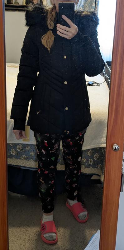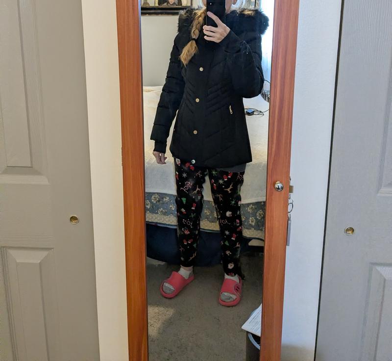 Very warm, comfy coat kept me warm in frigid nyc weather. I like the slightly longer length but would have appreciated double zippers to be able to unzip the bottom when seated. Also, would prefer a metal zipper. The hood is huge & cannot be closed properly but I use a scarf to keep it closed. The huge faux fur trim is almost comical but I don’t mind that. Overall I’m very satisfied with this coat & especially considering I got it at a great sales price!