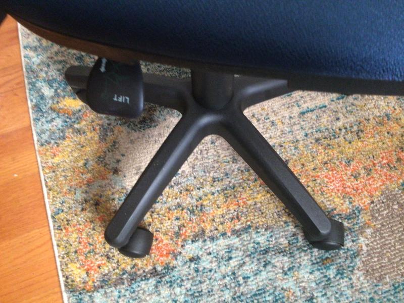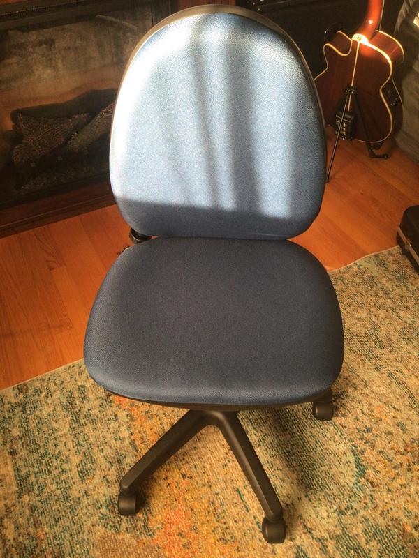 The mid back navy blue swivel office chair is comfortable. It is easy to move around. Hard time getting the back tightly put in. A smaller office chair and it fits nicely tight up to the desk. The back piece moves easy to make it comfortable to lean on.