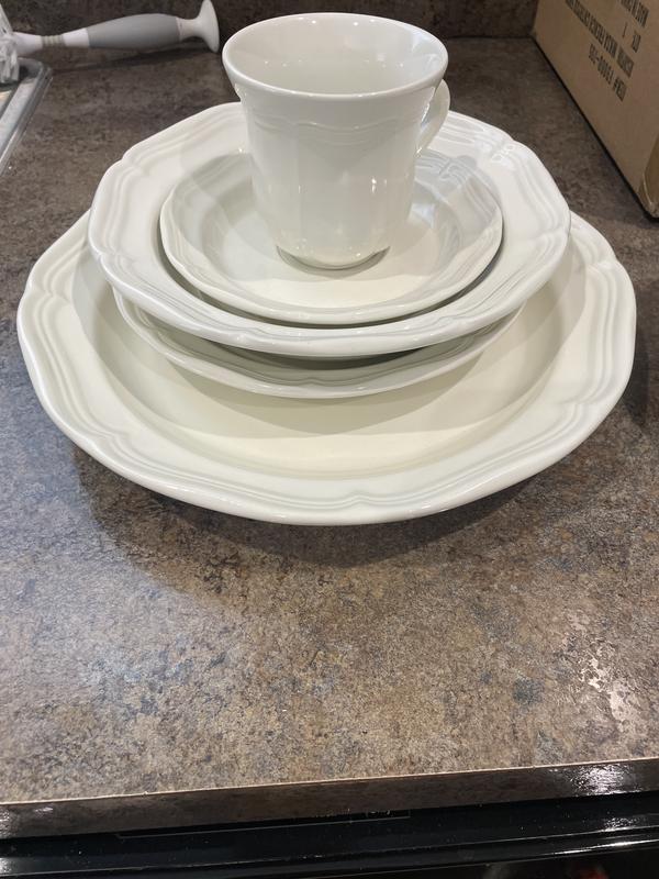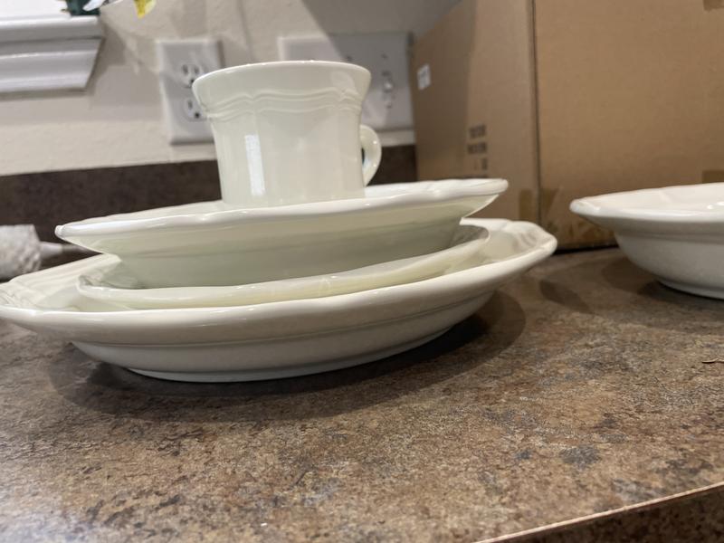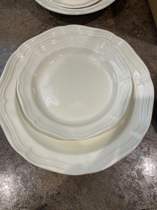 Please be aware the picture shows a bright white however the description states finished in a cream glaze. This dish setting is not a bright white as shown in picture (see my pics). I thought because the OTHER setting was cream in color and finished in a cream glaze as the picture showed this that the one I was getting was a bright white as the picture shows. This is not the case. I talk to Macy customer service and you have to pay attention to the description . A Mikasa French Country in Bright White color simply does not exist because both have a cream glaze finish. However the one is slightly closer to a true white. this is poor advertising on Macy’s part! Also I think Mikasa should work on fixing the design of these plates & make them more flat they are almost like a larger soup bowl. Also think the salad plate could be an inch wider as it looks small when placed on the dinner plate. I believe the soup bowl is wider. these are beautiful, great quality & I love the scallop design.