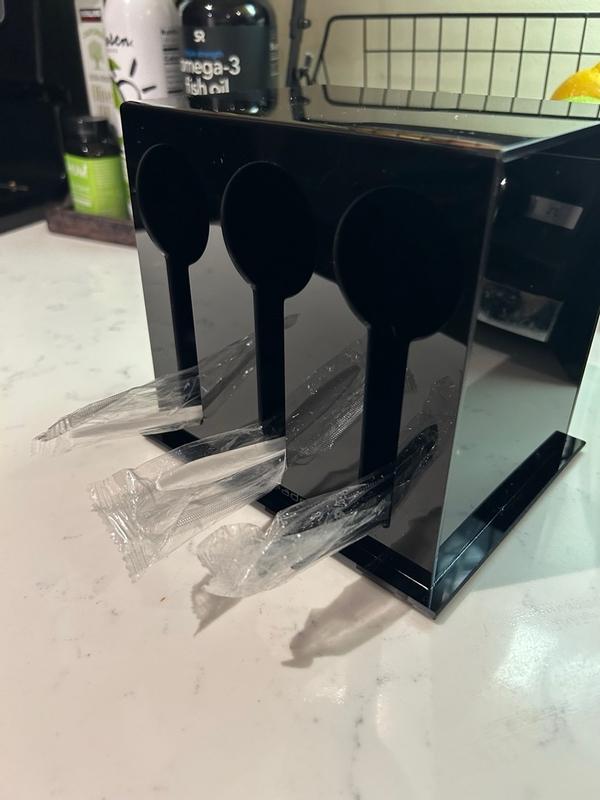 This little organizer is perfect for our office. It doesn’t take up a lot of space and can be easily stored in the cabinet or on the countertop. It is also easy to move it around when we have office parties it fits a good amount of plastic utensils, and keeps them in securely.