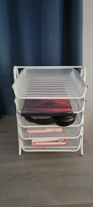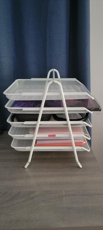 five tier paper tray, desktop organizer, file, storage workspace office, metal mesh works great. It looks nice on the desk and it’s really nice that the trays are removable so that you could take your trays of paper with you. wasn’t difficult to put together.