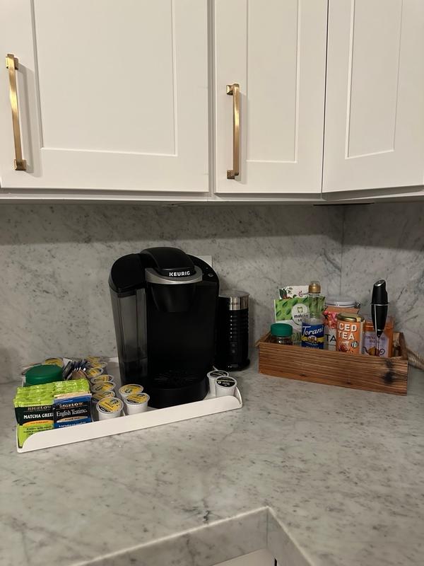 Very simple coffee station organizer. I don't have a single pot brewer but I have enough coffee to fill this up and make use of the space. Displays it so when we have guest over they can easily choose what they would like coffee wise :). Simple clean look.