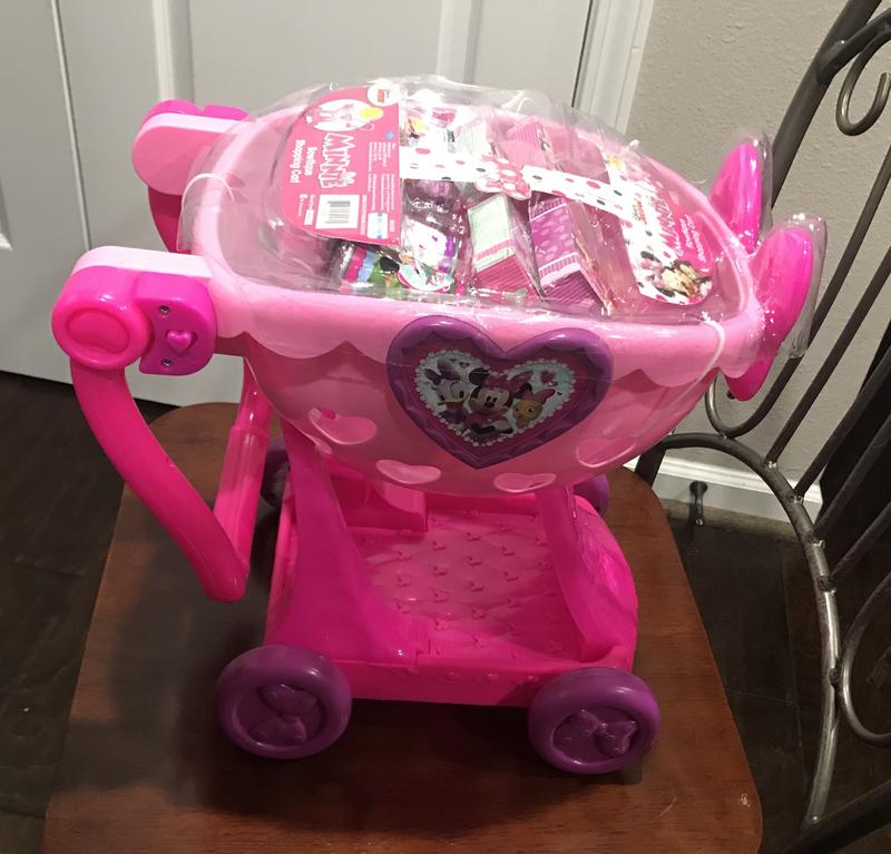 This Minnie shopping cart is darling. Our great niece loves it and plays with it hours every day. She shops and fills it with groceries, then dumps it all out and starts over. We did buy more “groceries” for in it. I would highly recommend.