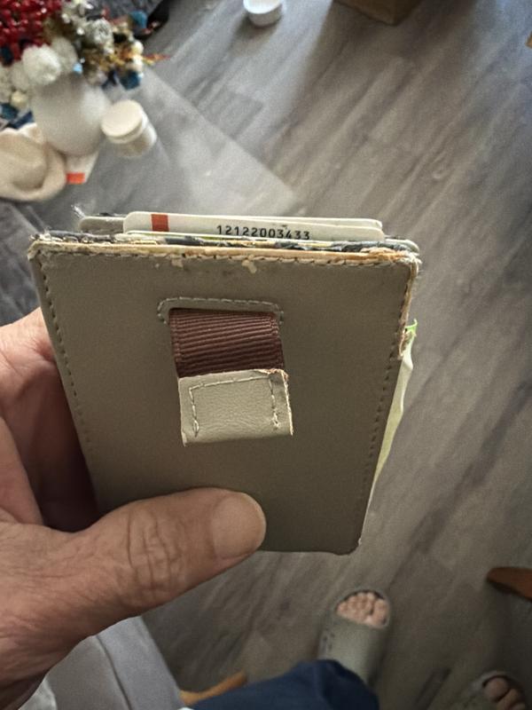 I was looking forward to slimming Dow my wallet as I carry it in front pants pocket. Attractive looking two-tone wallet… but it’s not well made. When you open the wallet the leather flap from the right side that normally runs under the left side is raggedly cut and pops out if you open the wallet all the way and the rough edges of this leather?( very thin or else it’s faux leather, not sure).. start to crumble in tiny pieces. Waste of $$$. They should have carried that pice through to tuck in at least halfway under the left side, so it doesn’t pop out… it looks terrible when you open the wallet all the way.