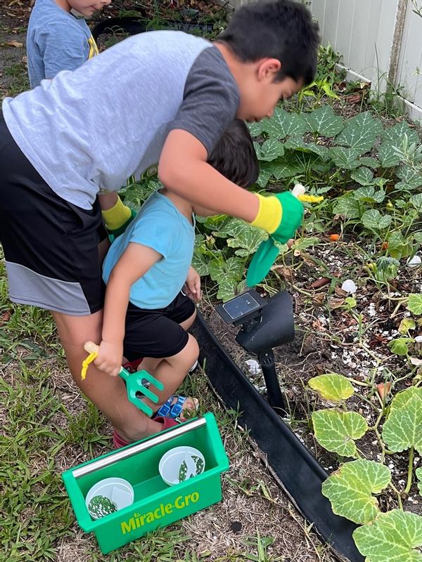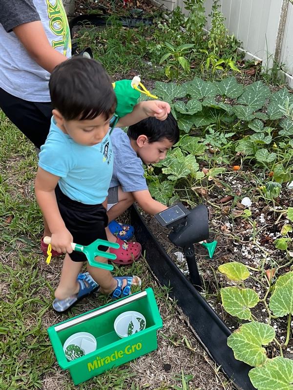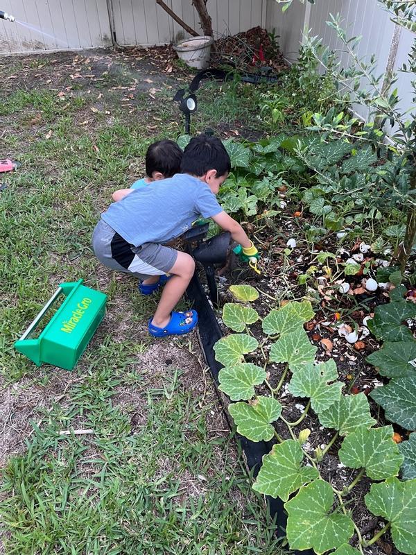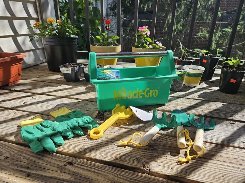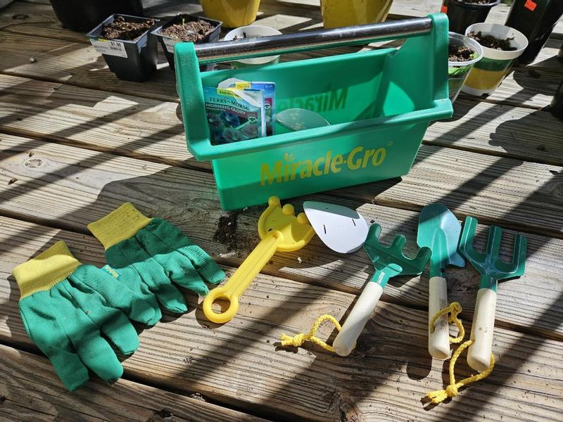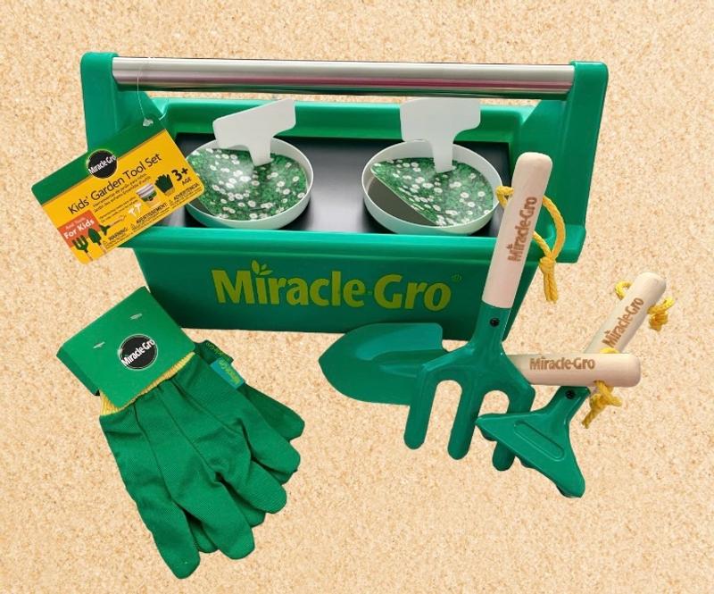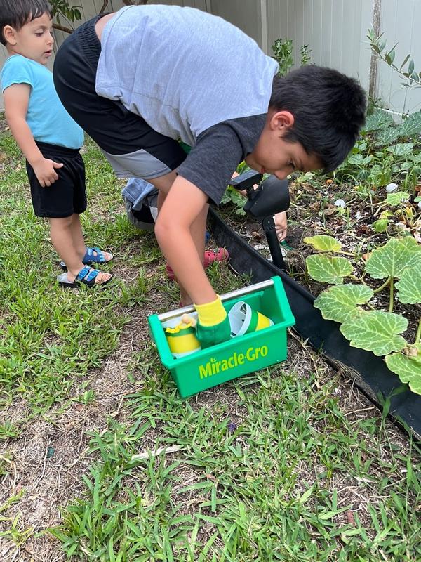This miracle gro children toolbox for garden set is great for kids to learn to help in garden. Easy to carry for little hands and not heavy, no need to worry it will snap and very durable.