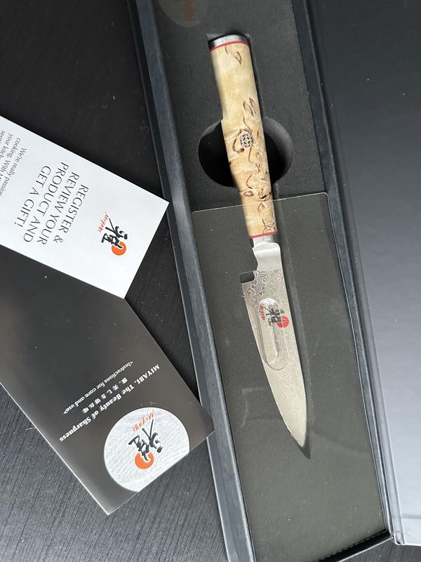 Beautiful knife and sharp! (I've already accidentally cut myself with it - not seriously - so don't be a klutz like me). I've wanted to upgrade to some seriously quality knives and Myabi is it. Expensive, but managed to acquire a couple others at discounts. If you can afford them, they will do the job.