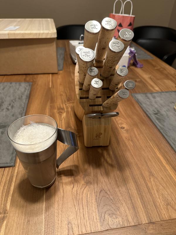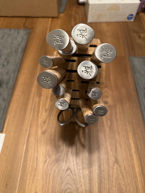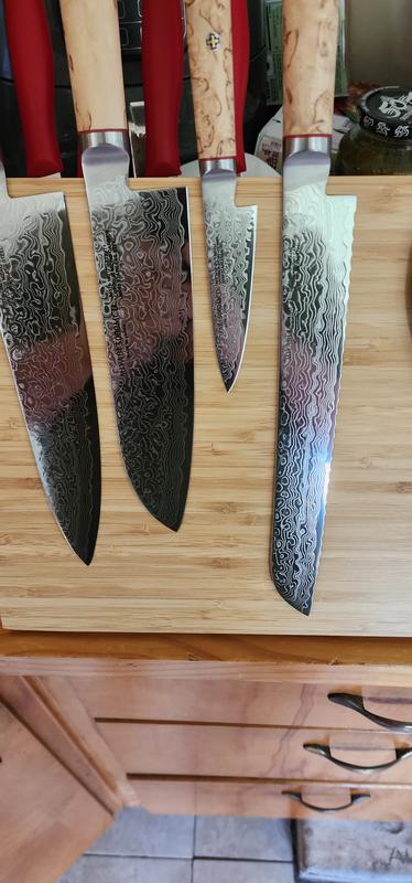 Beautiful Knife Set, I love the birchwood handle and the blade design. It cuts just as good as all ZWilling Products and comes with a bit more maintenance and care. After cooking for 20 years, this was a gift from my husband and I am so grateful to have this set.