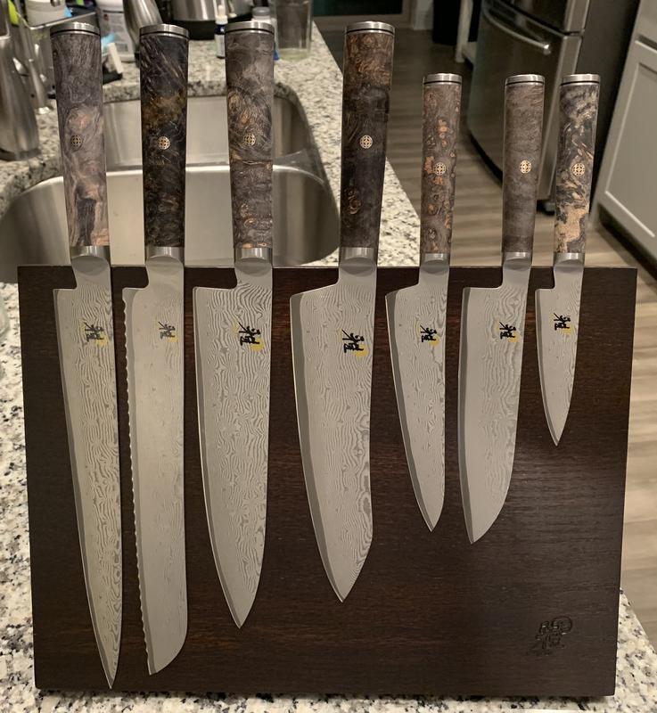 The knives are beautiful, they look great on display on the easel stand. I love the way they feel in the hand. They are awesome to use, I love preparing food with them. You can get paper thin slices with no effort. The only thing I was not impressed with was the easel. The packaging for shipping could have been better, and the easel arrived with a hairline crack running thru a portion of its center.