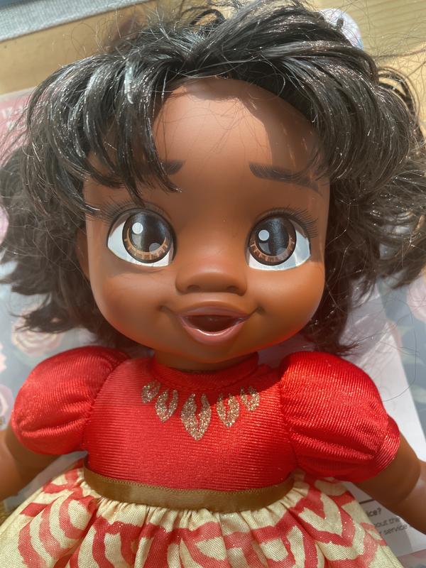 This is the cutest baby Moana doll . She has a soft body; perfect for cuddling and hugging. She has a red Tiara and a cute red and yellow little dress With the cutest dark brown hair. My daughter loves taking care of her and doing her hair. This doll is quality and will hold up a long time.