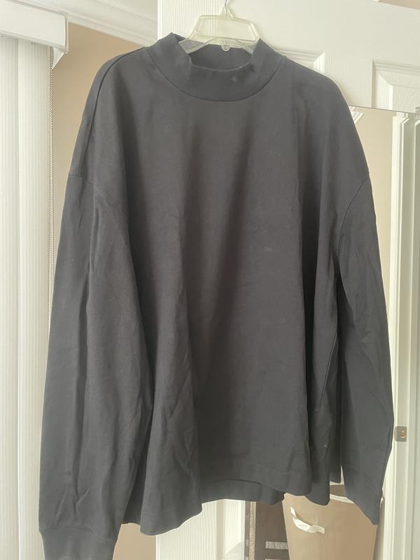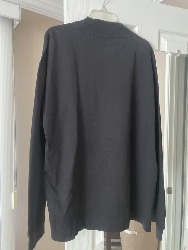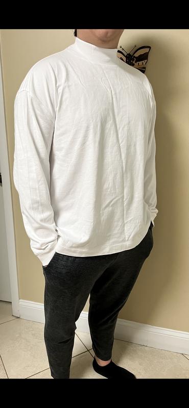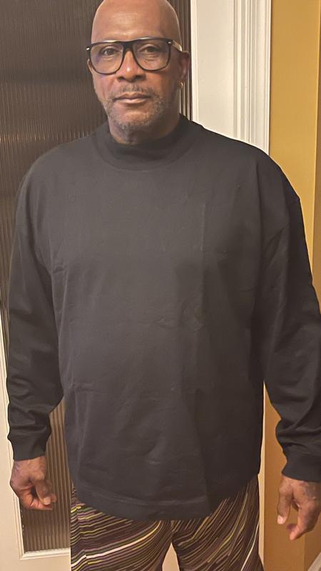 Nice shirt. Thicker, stiffer material than T-shirt. Came up under a search for turtlenecks but is a mock turtle or funnel neck. Will learn not to trust search.