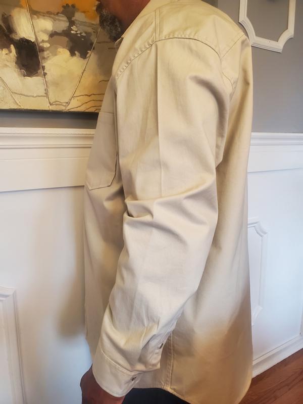 True to size, if not a little more. It’s a little more boxy than I’d normally wear, but makes a great over shirt. Heavy cotton fabric suggests it’s going to wear well. I’ve worn it over a tee, polo and even a sweater. I never button it, though I could. I think of it more as a jacket than a shirt. Between the length pad the weight of the fabric it just has that feel.
