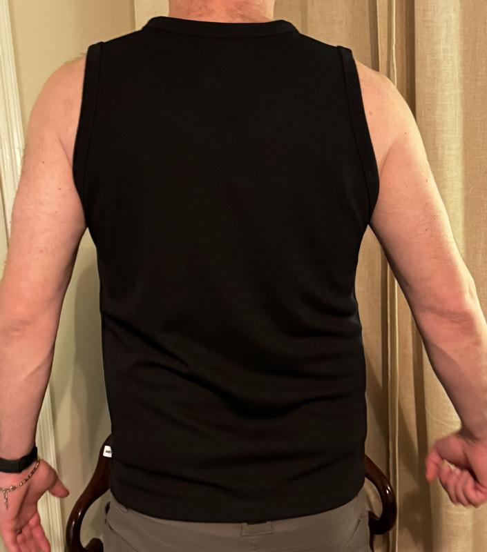 This is a thick high quality tank top. It is tag less, made of comfortable material, and no shrinkage after washing. The seams are also thick so it won’t be a seamless undershirt if you want to wear a tee over it. This is a medium on my 5ft 7in 135lbs teenager. The back collar goes high into the neck area. Not meant to be snug to the body. It also seems wide on the torso area.
