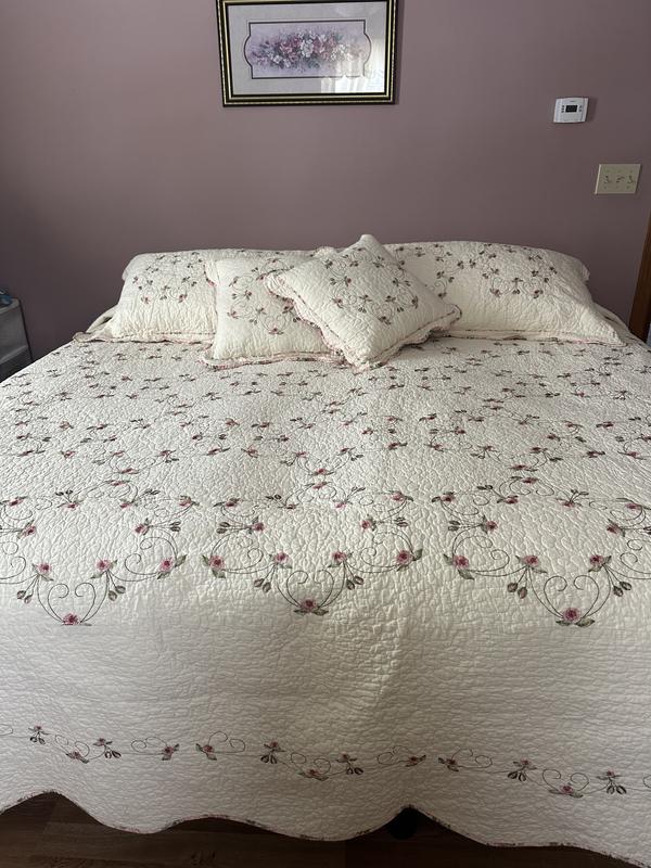This is just beautiful. The embroidery is fabulous. The scalloped bottom is gorgeous. It’s more of a spring/fall bed spread/comforter. I ordered a King size even though I have a Queen size bed. My husband rolls over and leaves me without any covers. Not anymore! I took 1 star off because I’m worried that the embroidery might start coming undone with use and washing. For right now, I recommend it. It’s gorgeous.