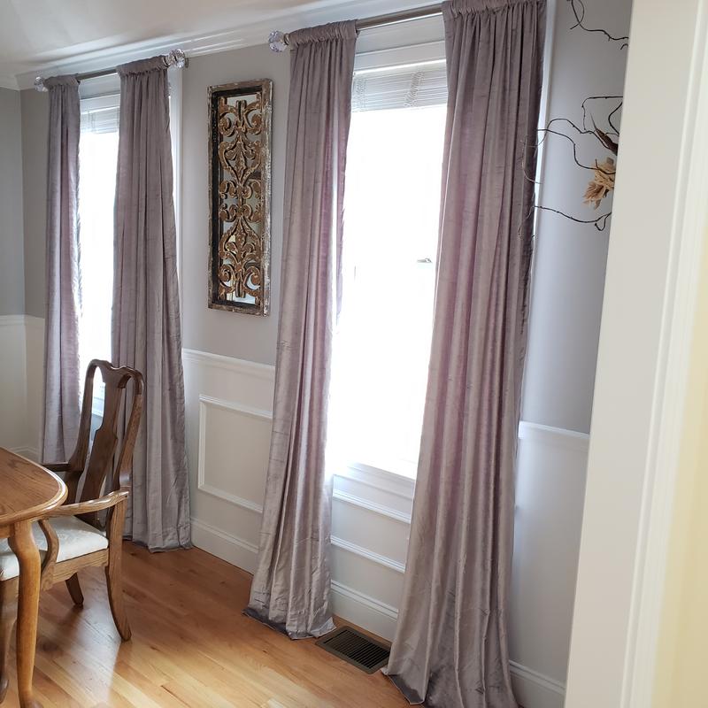 These are fabulous! very formal and dramatic, put your curtain rod higher up for this look if you do not have high ceilings. you can even make the rod wider than the window so it appears larger, they are lined and very wide, soft and very pretty. silver is like a light to med grey.