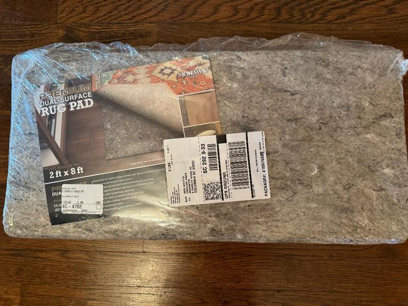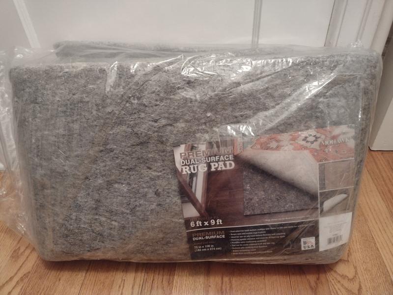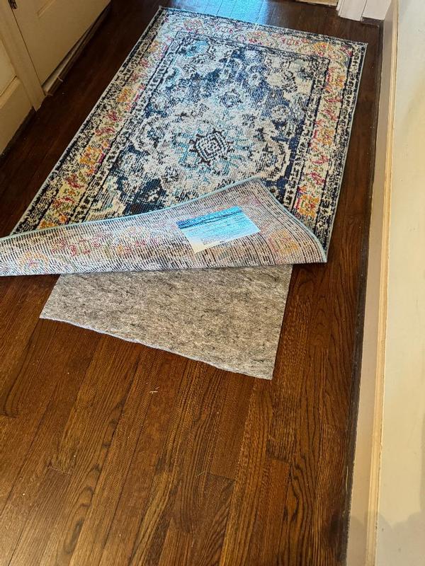 This 4x6 Mohawk rug pad has been the perfect addition to my entry room. My area rug is jute backed and never stayed in place unless anchored by furniture but now I can "open" up the space since there is no skidding or movement at all. Having been placed in a high traffic area for about 6 weeks through snow, salt, and slop, there are no signs of deteriorating on either side. The top fibery part grips my rug strongly and the bottom rubber holds the pad securely in place. Thin enough to not raise the level of my rug creating a trip hazard but thick enough to help protect my floor without residue or sticking. And another really great plus- ZERO ODOR, which is why I don't buy rubber backed rugs, they stink! No worries with the rug pad, perfect perfect perfect :)