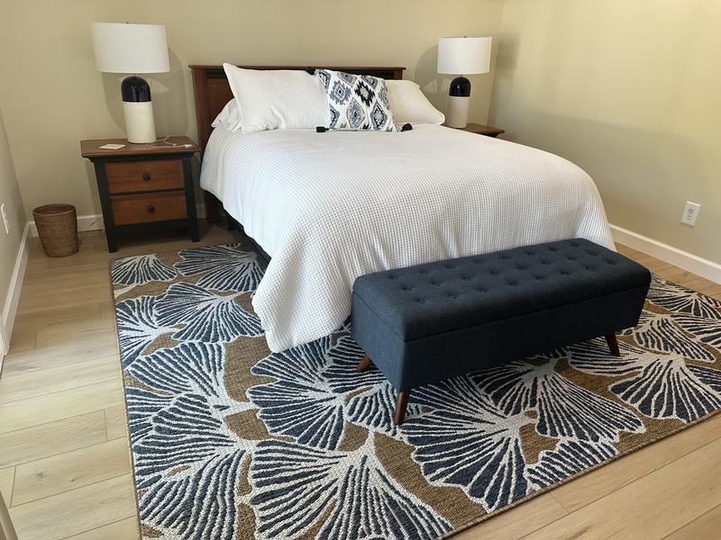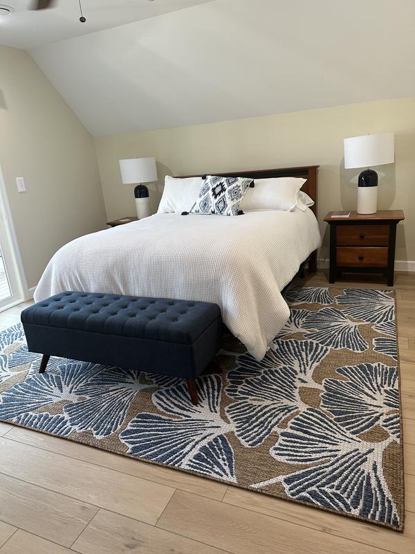 An incredibly chic rug. The rug features a delightful plush softness that also boasts great toughness. The distinctive orange leaf design pops off perfectly on the gray base color, so it is great for bringing a room aesthetic together.