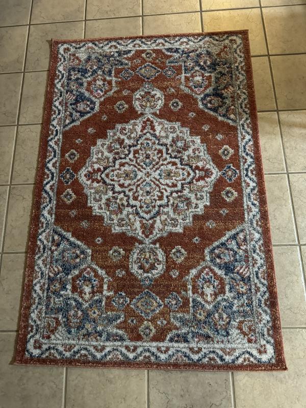 Very pretty rug with nice, bold colors. Looks great in my living room and makes it feel more cozy. I was excited about this product because it was described as machine washable, but it definitely isn’t which is a major bummer. I have an older dog who sometimes has accidents, so I was looking forward to being able to clean it quickly if needed. Even after several weeks the corners would still be a bit rolled up as well, from being packaged.