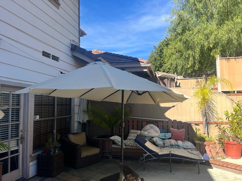 We love this umbrella. We thought the size would be too big but it’s perfect to cover the area of our patio. We love the solar LEDs, they are very helpful at nighttime. It moves a little too easily in the wind, but it’s easy to move back. We are very pleased.