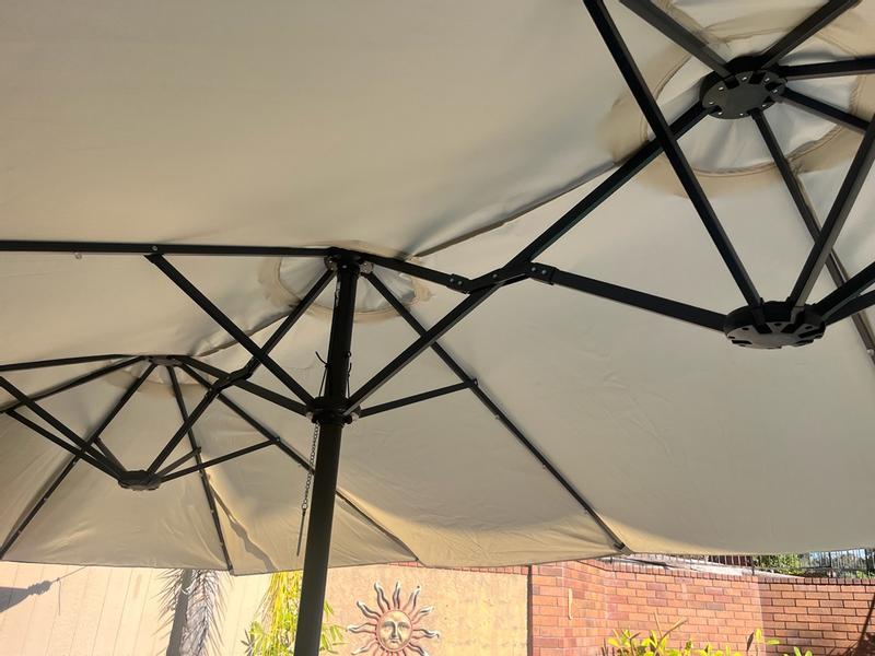 Absolutely amazing giant umbrella! This is like 3 patio umbrellas in one! It spans 15ft! It took less than 15 minutes to set up and is very well made and sturdy! It is heavy so it is a two person job. It even has lights that are powered by solar on the top of each of the three umbrellas! Living in CA we use umbrellas everyday by the pool! This one gives so much shade it is simply the best umbrella I have ever owned! I will buy another one to use on the other side of my pool! I received this product for free for my honest review! Honestly, this is the best umbrella I have ever used! I highly recommend! 😁