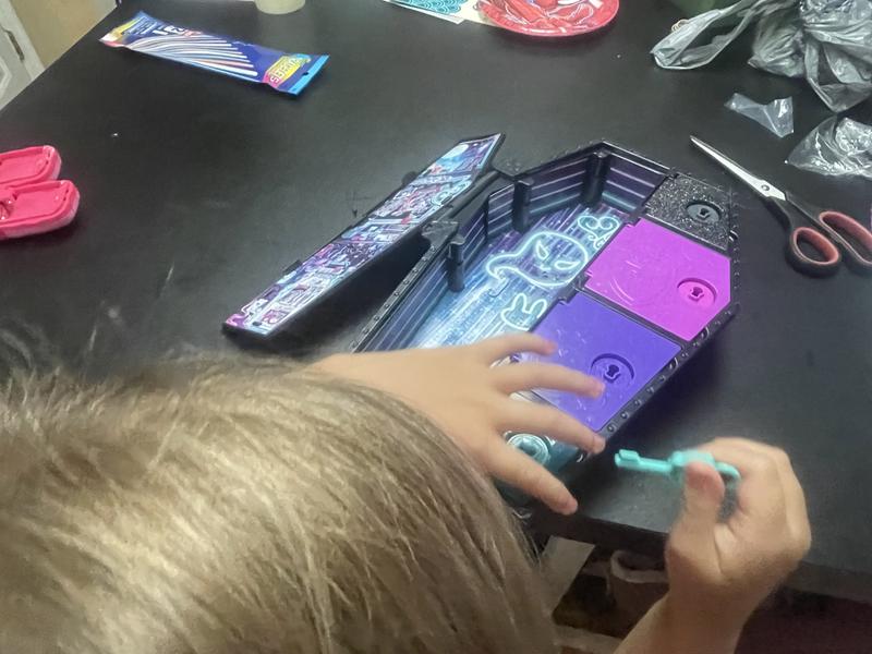 My daughter has been completely thrilled with this Monster High Skulltimate Secrets Twyla doll! She had a wonderful time opening up Twyla’s special coffin-style locker, which featured four individual small compartments, each with its own special colored key to unlock it. She was delighted to find subsequent keys to unlock each new compartment, in mystery bags that also held fashion accessories to dress the Twyla doll. She had so much fun placing each key into a small bowl of water in order to reveal their true color. The toy includes two distinctly different sets of shoes (one pair of dramatic tall boots and one pair of sneakers), to dress Twyla in different styles. She also comes with very cute clothing (my daughter’s favorite piece was Twyla’s short sleeve hoodie with adorable big ears), and other various small accessories, such as earrings and a purse. There is also the cutest little plate of tiny monster-riffic cookies we have ever seen! My daughter loved that there was a cute keyring also included to add all the special keys onto, in order to keep track of them easily. Twyla instantly became her new favorite toy, and she has been toting her around the house everywhere ever since she arrived! She continues to enjoy playing with the compartments even now that the mystery bags have been opened, and has fun putting Twyla’s little fashion treasures away safely inside. She also really just loves the Twyla doll herself, including the glow in the dark features, and thinks she is beautiful and very cool. Overall we are very happy with this toy, it’s brought her a lot of joy and playtime, and now she’s hoping to get one of Twyla’s other Skulltimate Secrets friends very soon!