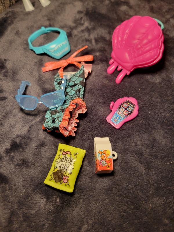 This Monster high doll is so eye catching with her bright clothes, shoes, long rainbow coloured hair, hair accessories and earings, mobile, bag, sunglasses, water bottle, crisps, super cute pet and food and changeable swimwear! (All accessories are for the doll so very small) The dolls Arms & legs bend so very movable, clothes are removable so can be changed, my grandaughter was instantly drawn to this doll by her super cool style and bright colours so it's very appealing to children recommended age is 4+ A very nice set and recommended!