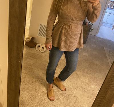 Honestly, I love these jeans. I am in my 2nd trimester and currently wearing these as one of my first pairs of maternity jeans, it will be nice to get use out of them post-pregnancy as well. I am 5'3 about 145 right now and the small fits perfect. I typically wear a size 4 in jeans. They are cropped/ ankle length even on a short gal like me, which I prefer. The leg of the jeans are not super tight, but not baggy either, and yes they are loose around the ankle. However, that is the style right now! Great jeans, I would recommend. TTS.