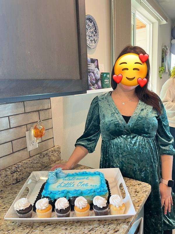 Wore this dress for my recent baby shower, totally comfy and cute and stretchy! Dips low so make sure to wear supportive bra or tank under it, and it is short but you could get away with tights. I wore with leggings and was super comfortable all day.