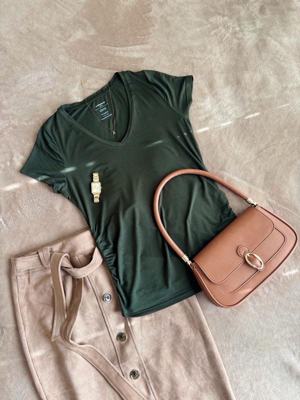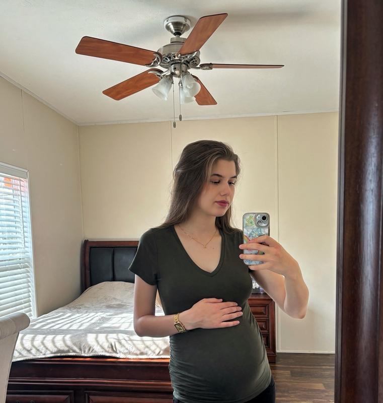 I recently received the Motherhood brand side rouched V-neck tee in black through a promotion, and I couldn't be happier with it! The fabric is incredibly soft and comfortable, making it perfect for both everyday wear and lounging. The side ruching provides a flattering fit that hugs my curves beautifully without feeling restrictive. I love how versatile this tee is—it pairs perfectly with jeans, leggings, or even shorts for a chic look. Plus, the deep V-neck adds a stylish touch. I highly recommend this tee to any expecting or new mom; it’s a must-have addition to your wardrobe! Five stars! ⭐️⭐️⭐️⭐️⭐️