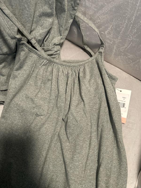 This set had been a lifesaver when breastfeeding. The clips on the tank top make it very easy to use. The pants are so comfy and have a wide stretch band. The color of the set is grey and not black as pictured. Overall a lovely soft comfortable lounge outfit.
