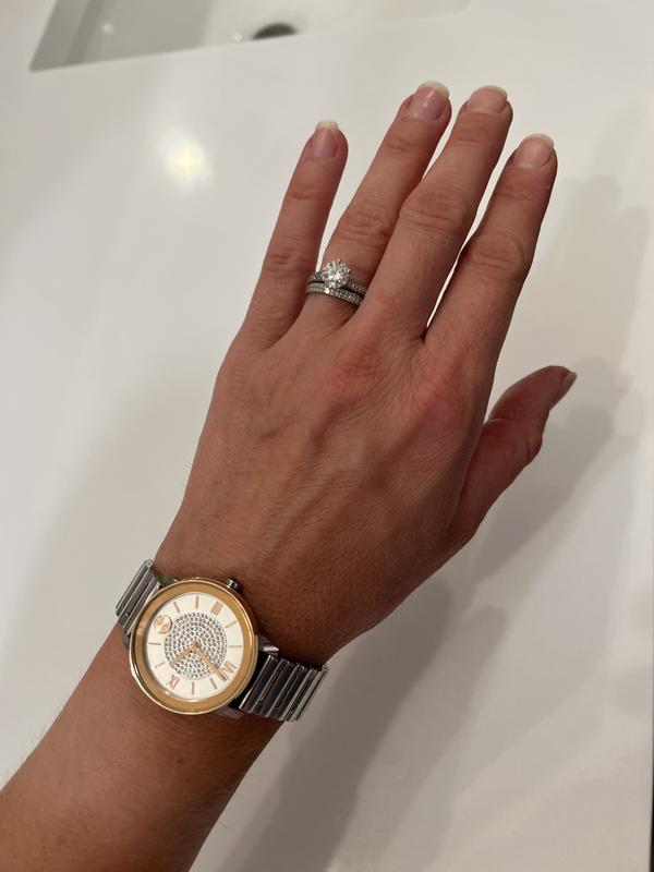 I bought this watch online, not in person, and was very pleased. It's a great size and and has a beautiful sparkle. I love it!