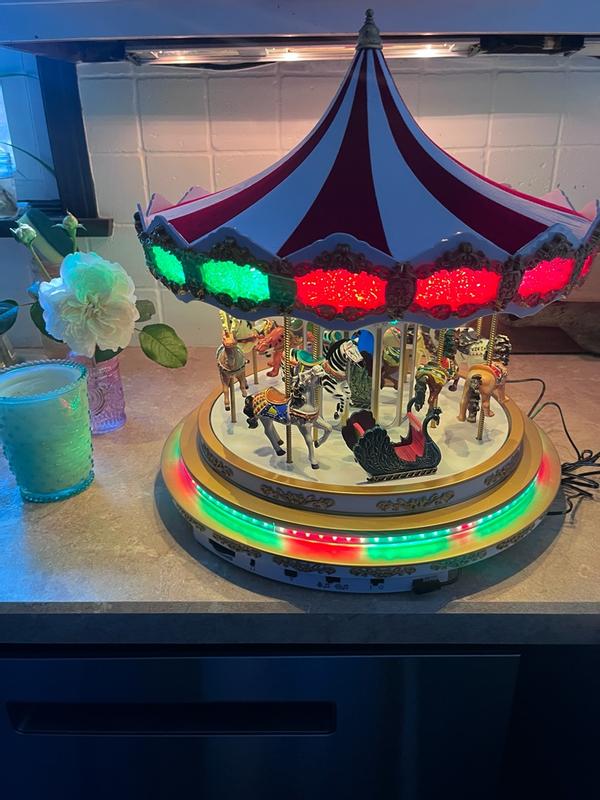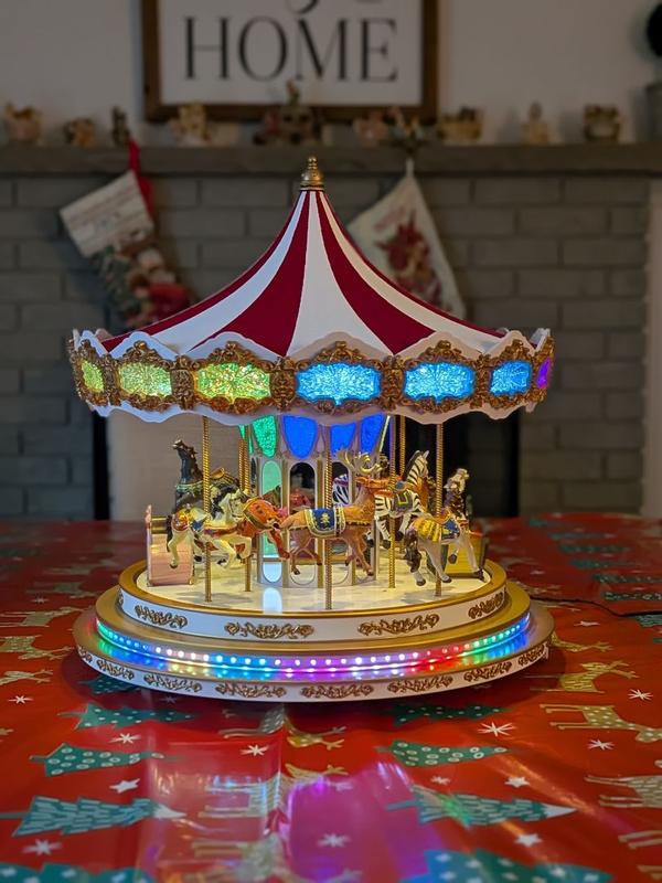 This is a beautiful Christmas carousel that will add some festive spirit to my home this holiday. It’s 17 inches tall, but can fully fit on the corner of a table taking up less space than I thought it would. It is very cute and fun for my kids. The carousel has a light show and plays forty different songs, which is very fun for my family because we love Christmas songs. It revolves and the animals on the carousels go up and down. Very festive and fun for the whole family! I especially love the reindeer and the sleighs. There are controls to adjust volume and change the song or light show. This was very easy to assemble and get plugged in. It feels less fragile than I thought it would be. Very cool. I can’t wait to have it out when my family visits this holiday season. Highly recommended!